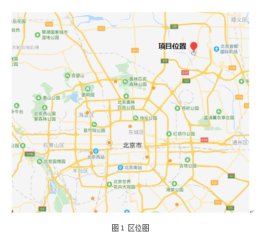 北京新国展二、三期项目位于北京市区的东北部,顺义新城后沙峪组团东南部,距市区、城市副中心均约20公里(见图1)。