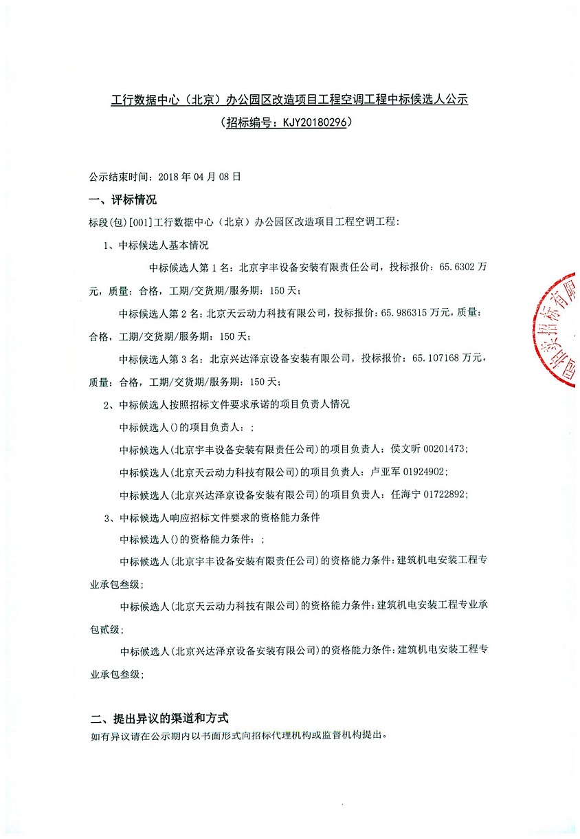 工行数据中心(北京)办公园区改造项目工程空调工程中标候选人公示