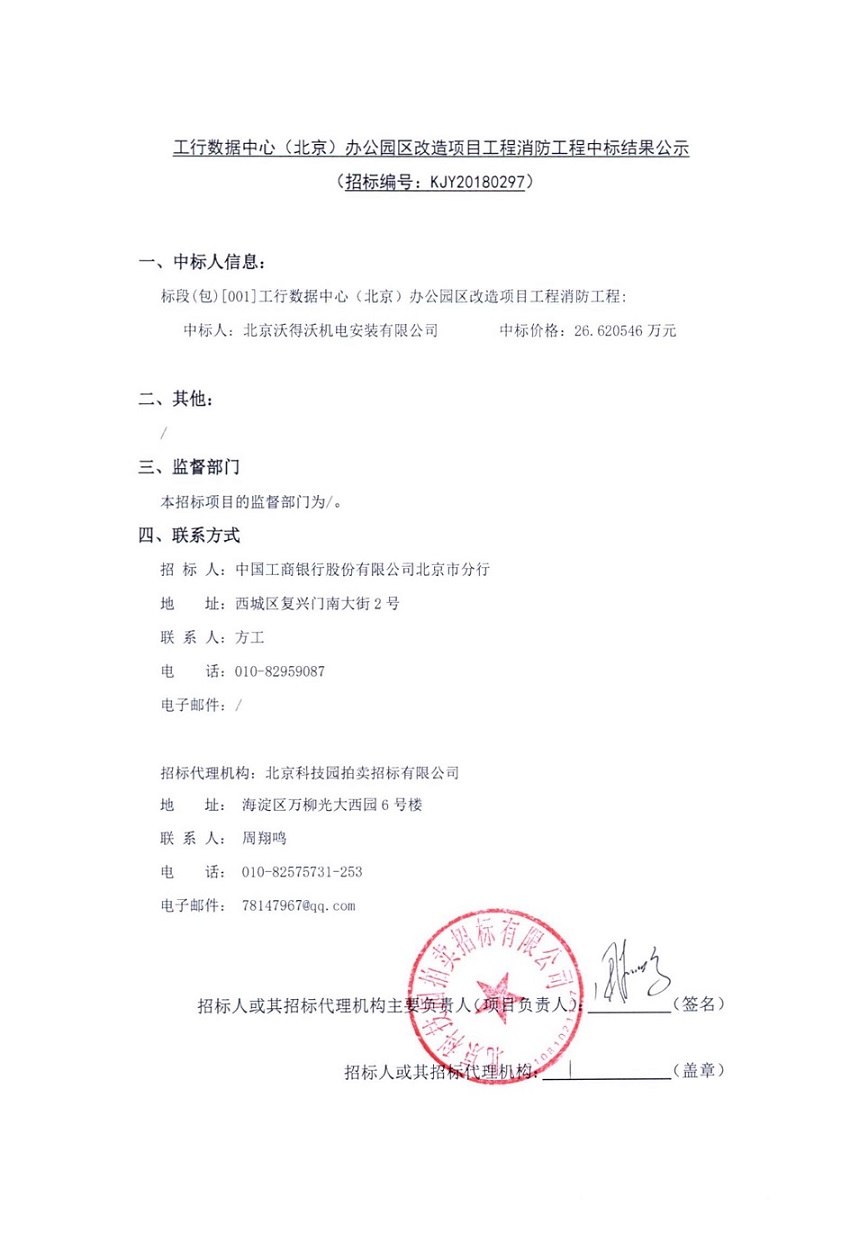 工行数据中心(北京)办公园区改造项目工程消防工程中标结果公示